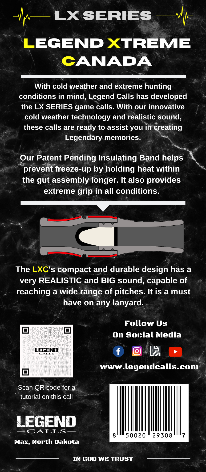 | The LXC is our brand new Canada Goose call from the Legend Xtreme Series. With our Patent Pending Insulating Bands covering a larger portion of this call, it is sure to give you improved insulation for extreme hunting conditions. These bands provide additional features such as improved grip, impact protection, and awesome graphics. The LXC also features our brand new LEGEND guts. These guts were designed to provide easy setup and tuning as well as produce a top notch sound that'll have geese landing in your lap. -Polycarbonate -Preset LEGEND 2.0 guts (New Version) -Insulating Bands (Patent Pending) |